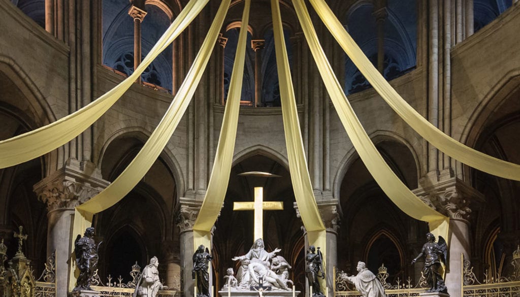 À ces causes, nous avons déclaré et déclarons que prenant la très sainte et très glorieuse Vierge pour protectrice spéciale de notre royaume, nous lui consacrons particulièrement notre personne, notre État, notre couronne et nos sujets, la suppliant de nous vouloir inspirer une sainte conduite et de défendre avec tant de soin ce royaume contre l’effort de tous ses ennemis, que, soit qu’il souffre du fléau de la guerre ou jouisse de la douceur de la paix que nous demandons à Dieu de tout notre cœur, il ne sorte point des voies de la grâce qui conduisent à celles de la gloire. Et afin que la postérité ne puisse manquer à suivre nos volontés en ce sujet, pour monument et marque immortelle de la consécration présente que nous faisons, nous ferons construire de nouveau le grand autel de la cathédrale de Paris avec une image de la Vierge qui tienne dans ses bras celle de son précieux Fils descendu de la Croix , et où nous serons représenté aux pieds du Fils et de la Mère comme leur offrant notre couronne et notre sceptre.