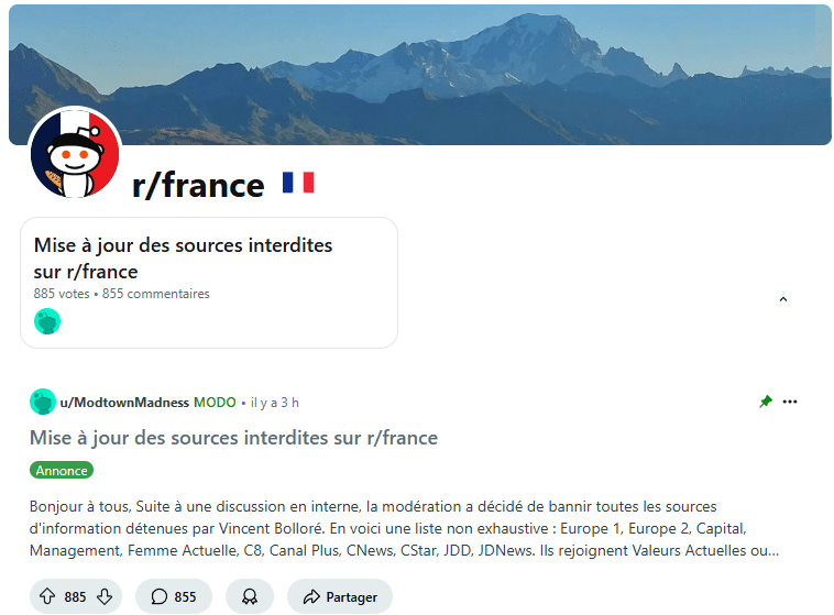 Censure sur Reddit Internet | Médias DR Julien Michel 13 janvier 2025 Les modérateurs du forum r/France (2,2 millions de membres) sur Reddit ont décidé de bannir toutes les sources d’information détenues par Vincent Bolloré. Partager sur Facebook Partager sur X Partager par e-mail