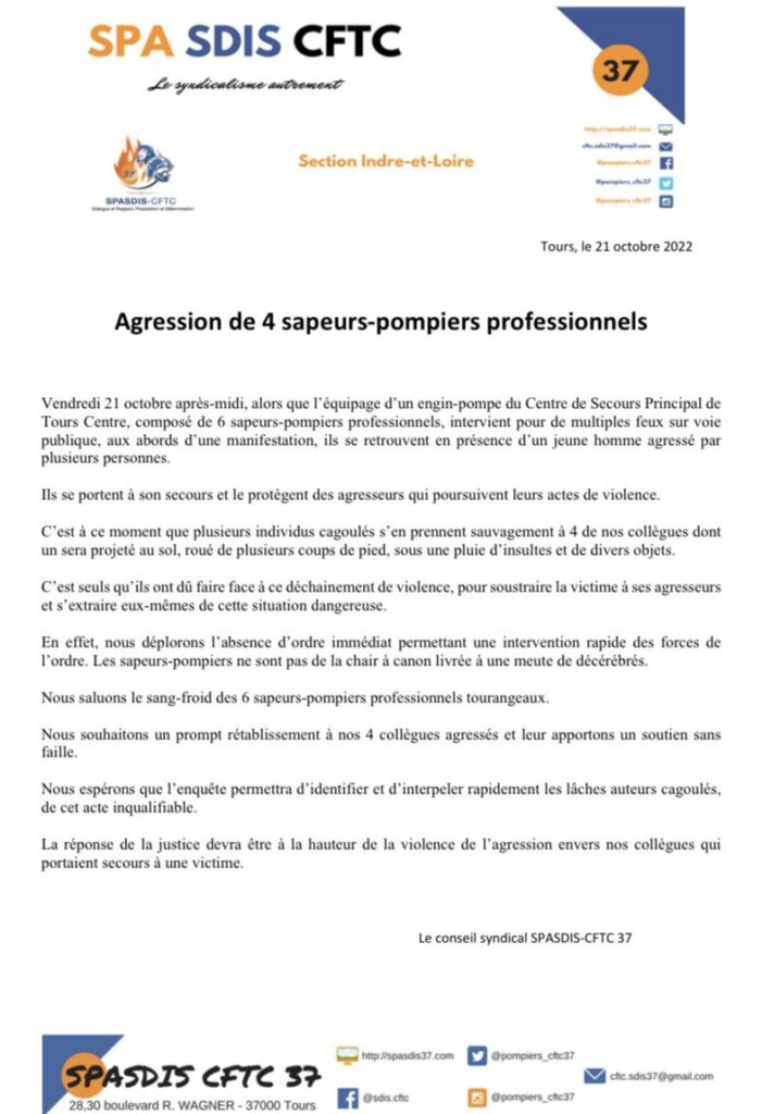 Ces images sont une honte pour la #France! Les voyous ne respectent plus rien! Des pompiers ont été violemment pris à partie, frappés et mis à terre hier à #Tours. Bravo aux #policiers qui ont interpellé 3 agresseurs. L’impunité pénale fait des ravages surtout chez les mineurs! pic.twitter.com/ltTKiyt3Nf