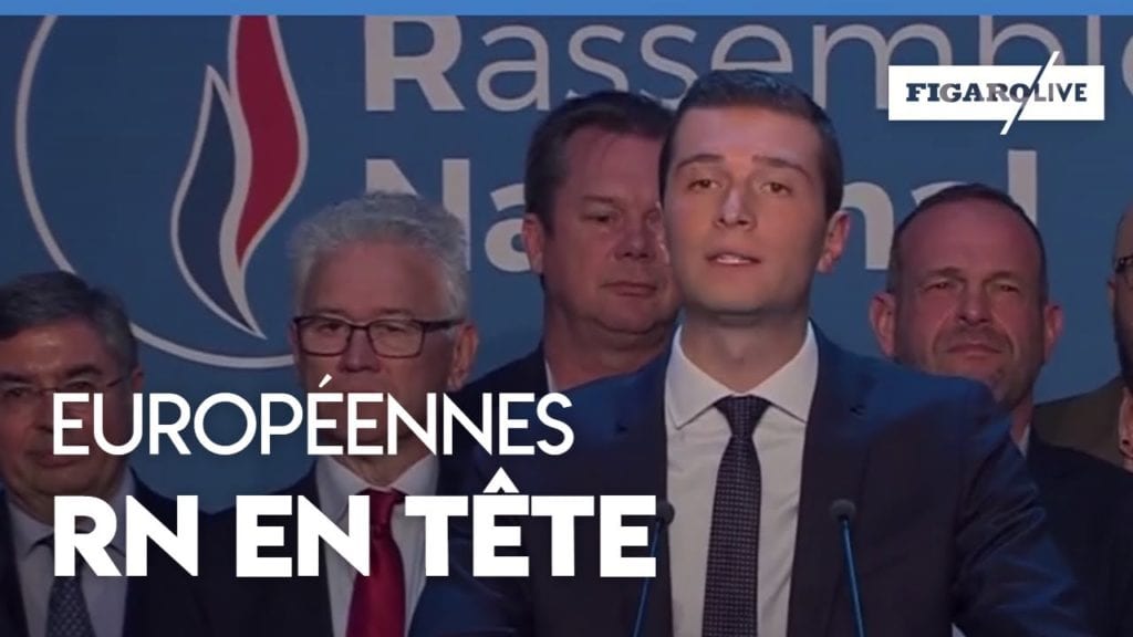 Juste après l’annonce des résultats des élections européennes 2019, Joradn Bardella est intervenu en direct, suivi de Marine Le Pen.