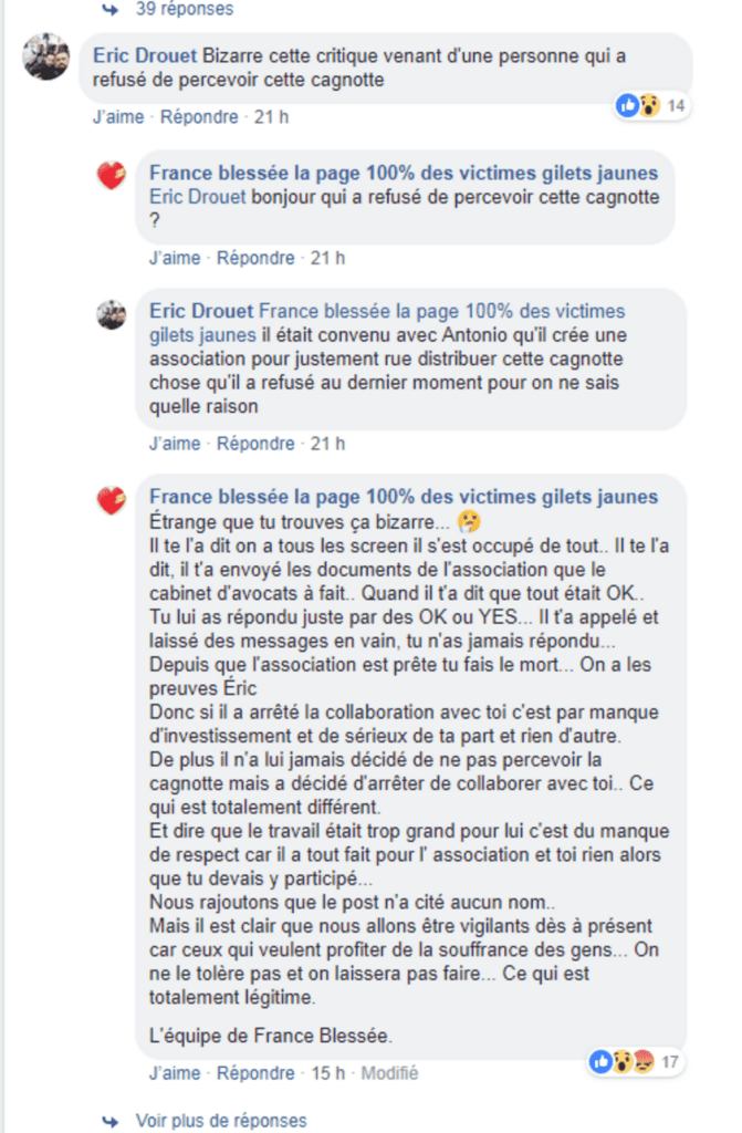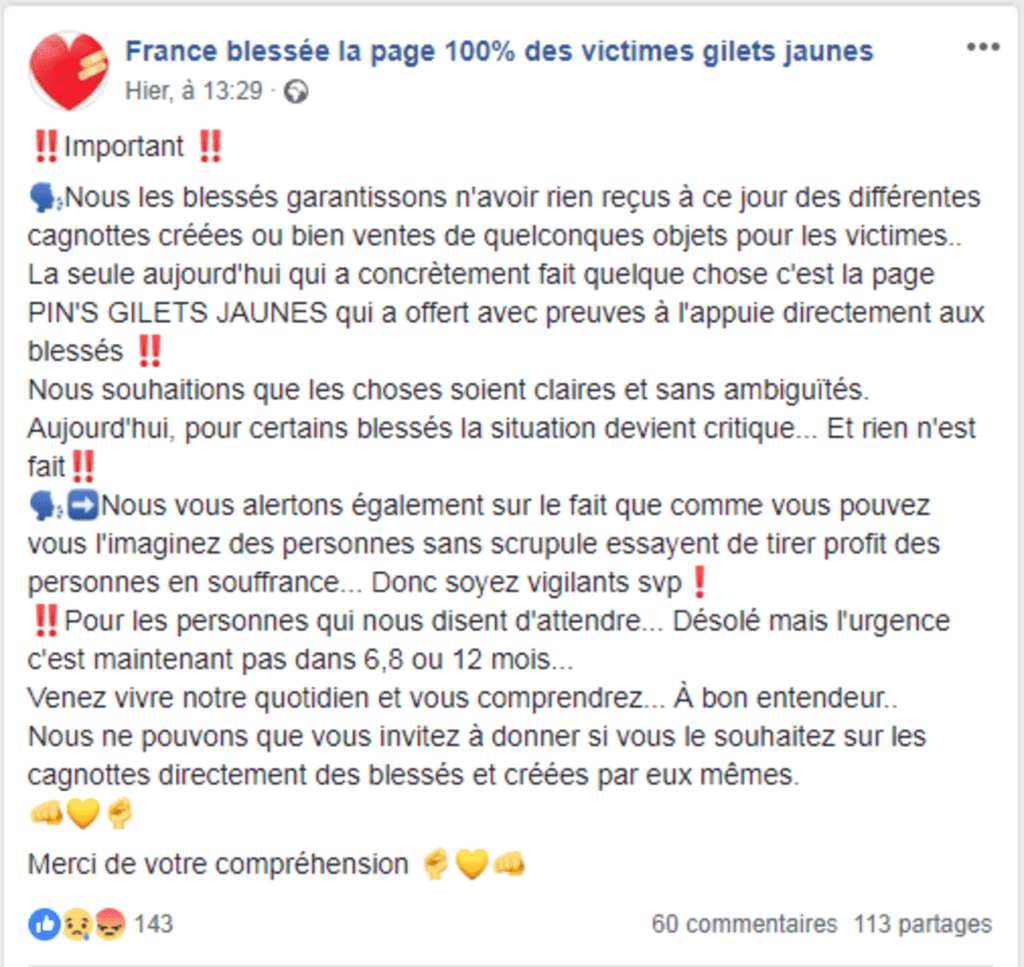 Dans le but d’alerter sur les éventuelles escroqueries, Antonio Barnetta, un Gilet jaune blessé au pied à Paris, a créé une page Facebook intitulée « France blessée ». D’après cette page, les blessés n’ont pas encore reçu le moindre centime issu de toutes les levées de fonds effectuées en leur nom.