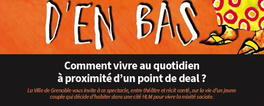 L’affiche de la pièce «Les copains d’en bas» présente une mention ajoutée par la municipalité : «Comment vivre à proximité au quotidien d’un point de deal».