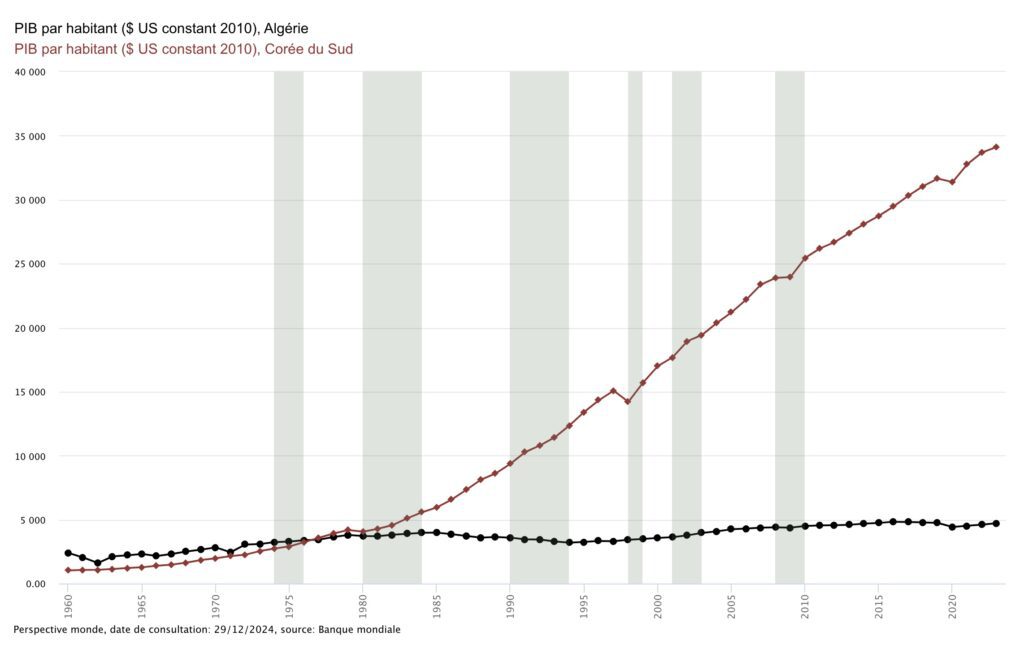 Territoire dans lequel la France n’a plus rien à faire depuis le début des années 60 – c’est à dire il y a 65 ans ! – l’Algérie, malgré des ressources naturelles abondantes, n’a jamais vu ses indicateurs économiques décoller. Il suffit de comparer le PIB de l’Algérie et de la Corée du Sud – ils partaient quasiment du même niveau, avec même un avantage pour l’Algérie – pour constater la triste réalité.