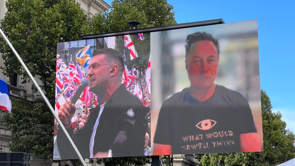 Plus inattendu, Elon Musk a pris la parole en direct par appel vidéo. L’entrepreneur planétaire, figure du courant Maga, a appelé à un « changement de gouvernement » immédiat au Royaume-Uni. Pas demain, pas après-demain : tout de suite. De quoi donner à ce rassemblement une dimension internationale, quasi insurrectionnelle.