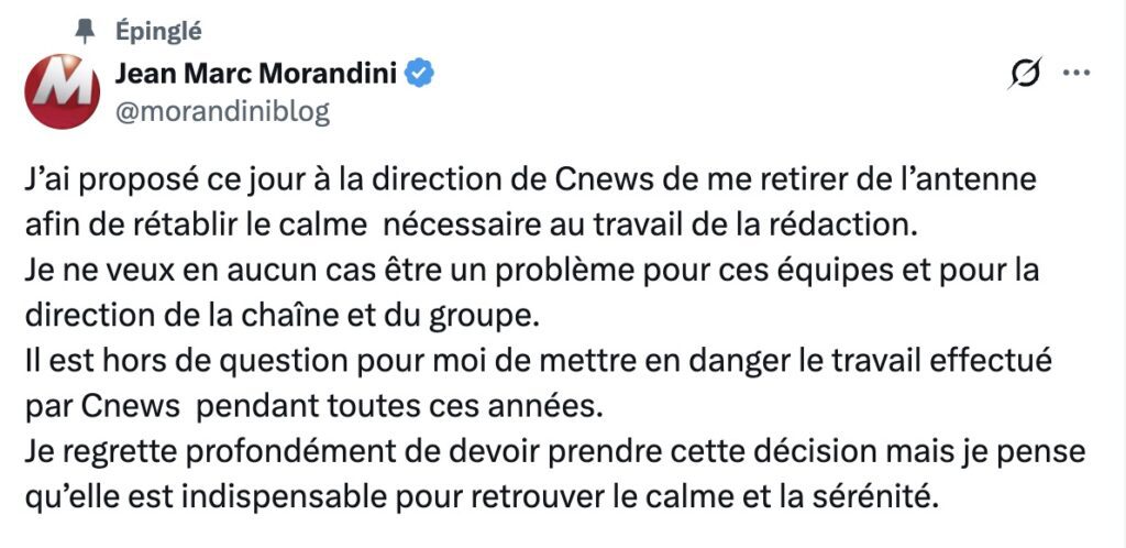 Faisant suite à l’annonce de la démission de Sonia Mabrouk et le trouble que toute cette affaire a semé au sein de l’équipe de CNEWS, Jean-Marc Morandini vient de publier l’annonce de son retrait de l’antenne.
