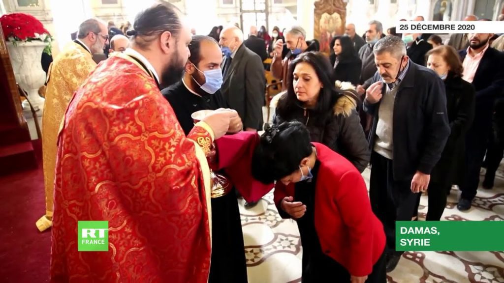 Le 25 décembre 2020, des fidèles se sont réunis dans la cathédrale mariamite de Damas, la plus ancienne église grecque-orthodoxe de la ville, pour célébrer une messe de Noël. Un nombre limité de participants a pu y assister, en raison des restrictions sanitaires liées à la pandémie de Covid-19.